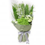 It blends the serene beauty of a lush green hydrangea with the pristine purity of white roses and eustoma. Adorned with elegant Matthiola and foliage, this gift conveys blessings of health, new beginnings, and tranquility. A perfect token of pure appreciation.
