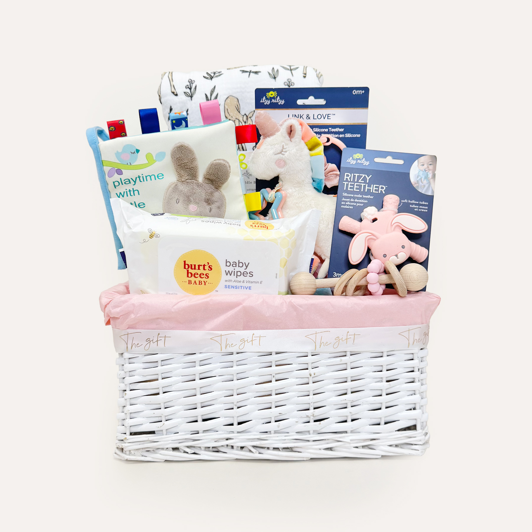 The Joyful Moments Baby Gift Hamper is thoughtfully curated for a baby's growth and playtime. From a soft and cozy 4-layer cotton swaddle blanket and a baby fabric book to stimulate sensory development, to teethers, a beechwood rattle, and a plush toy that soothe teething discomfort, every item is filled with warmth and joy. The hamper also includes a thoughtful addition of baby wipes for easy daily cleaning. This gift is not only practical but also brings immense love and warmth to both the baby and new parents, ensuring every playtime is filled with laughter.